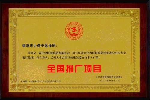 2022年4月《北京中西慢病防治促进会》授予:“桃源黄小侠中医诊所”为“基层医疗健康工作委员会会员单位"。《中国慢性病防治工作规划(2018一2022)》国家慢性病综合防治管理项目单位,全国名老中医专家承建设项目, 全国中医药非物质文化遗产保护和传承项目单位,北京中西医慢病防治促进会,基层医疗健康工作委员会,授予黄小侠——慢性病防治专家。