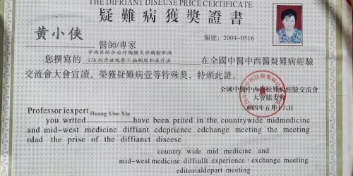 黄小侠中医主治医师在二十多年前,有高超中医技术,能治好重症妇科病的案例。90年代初,二十多岁患者小张患有多种妇科病,症状重,面色灰暗,重病缠身而无法工作,多处求医治疗,不见好转。当时有道人预言,说她只能活到三十五岁。经西医介绍,认识了国考中医主治医师黄小侠。从此以后,她一心一意只相信黄小侠中医主治医师,专心专用黄小侠医师中医方法连续治了五年。将她所患疾病全治好。五年后重返工作岗位。现在五十几岁了,身体比三十多岁要好,健康又精力旺盛。一人在家照顾两个孙子,还兼自家企业后勤部长。黄小侠中医主治医师,用中医方法调治重症慢病和疑难杂症,有丰富临床经验。只要您按照慢性疾病和疑难杂症中医疗程治疗,黄小侠中医主治医师都让您完全恢复了身体健康。就像病案案例,不胜枚举。黄小侠中医主治医师长期坚持学习学习再学习,提高提高再提高自己中医该疗技术水平。2021年又去上海中医药大学的附属医院上海署光医院的名医培训班学习。黄小侠中医主治医师长期学习,是让自己专用中医综合方法治疗耳鼻喉科病、妇科病、慢性病和疑难杂症,达到"手到病除,药到病除"效果。为桃源人民健康服务。现年62岁国考中医主治医师黄小侠,早在2000年8月就已经获得了“名医成就奖",“中医治疑难杂症论文一等奖”。可是国考中医主治医师黄小侠,还是孜孜不倦地长期坚持学习,不断创新和提高中医诊疗技术水平。慢性疾病和疑难杂症病人,找国考中医主治医师黄小侠治疗,是最明智和聪明的选择。