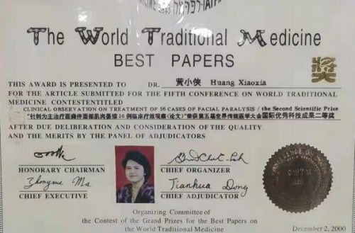 2000年8月中医论文在第二届新世纪国际医药优秀学术论文颁奖大会上,获“名医成就奖″。同时入选《世界医学界名人录》(中华卷)。2002年3月被选入国家人事部《中国人才辞典》中。