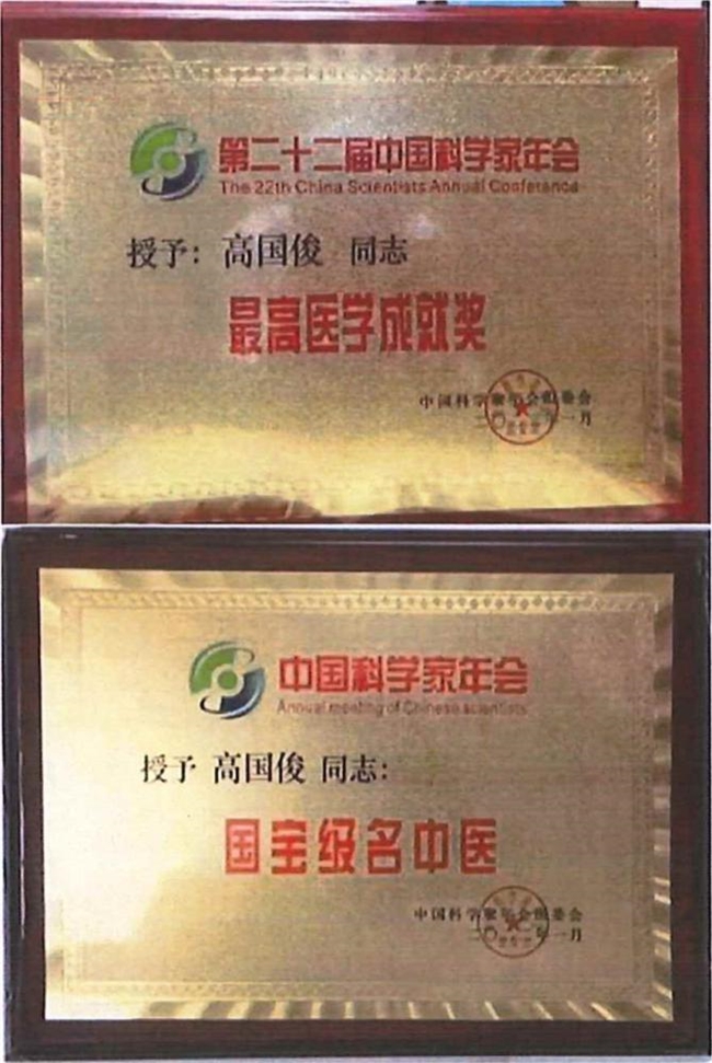 中西医结合(合璧)治疗肿瘤医学的奠基人高国俊教授行医几十年,始终把振兴中医药事业为已任,多项中医药研究成果荣获"世界华人卓越医家杰出成果金奖"中西医结合治疗胰腺癌、效果卓越,荣获"世界优秀创新成果金奖"。