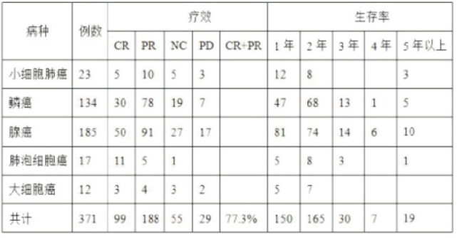 由表可见,经中西医结合治疗,一些病例仅14天-2个月复查病灶消失,缓解,病灶消失以后经中药长期巩固维持治疗,生存期已达1-2年以上,最长生存期达22年以上。这些病例促进肿瘤科学技术的发展,更新肿瘤治疗观念,开创了具有中国特色的中西医结合个体化治疗肺癌的方法。