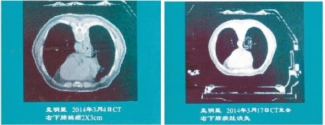 病例1:孟明星,男,55岁,连云港干部,因咳嗽,咳痰带血。2014年2月经CT发现右肺占位(中央型肺癌)气管镜示:右肺下叶见一菜花样新生物2m,病理为鳞状细胞癌,因病灶贴近心脏,无法手术。于2014年3月3日闻名前来,经应用中药三参莲苡南星汤、牛黄醒消丸,平消胶囊联合伽玛刀及特罗凯中西医结合治疗,至2014年3月17日模拟CT示病灶完全消失。一般情况良好,临床无症状,血象正常,已上班工作。(附治疗前后CT片)