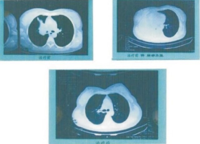病例3:孙雪妮,连云港粮食局职工,CT示右上肺鳞癌,给予GP方案化疗病灶进展,伴肺不张,经应用三参莲苡南星汤合牛黄醒消丸及特罗凯二个月,临床症状消失,CT复查右上肺占位消失,复CT片: