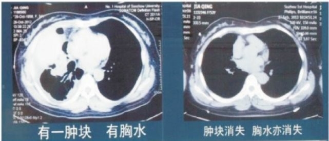 病例4:肺腺癌病例,贾青,女,55岁,2012年10月体检发现右上肺4cm肿块,CT示右上肺癌伴两肺散在性结节,病理确诊为肺腺癌EGFR,突变型。至2012年12月病情进展并发胸水,因拒绝放、化疗,经应用参苓白术散,牛黄醒消丸及易瑞沙,临床症状消失。CT复查右上肺肿块消失,胸水亦消失。