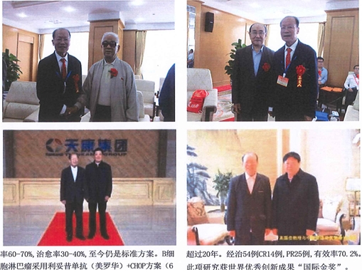 在治疗各类癌症的道路上突破医学瓶颈在研究治疗各种癌症疾病上,高教授不断刷新认知突破医学瓶颈,以天草方为主中西结合治疗恶性淋巴瘤达国内先进水平,使患者重获第二次生命,重返工作岗位恶性淋巴瘤采用西医治疗疗效较好,CHOP方案是第一代化疗方案,至今仍最标准方案B细胞淋巴瘤采用利妥昔单抚(美罗华)+CHOP方案6个疗程有效率89%完全缓解率56-59%,而中医药治疗恶性淋巴也获得较好的疗效。近30 年来在临床上我们长期以天冬、白花蛇舌草为主,中西医结合治疗淋巴瘤185例,有效率87,5%,在坚持巩固维持治疗的124例中,5年无病生存率达 81%,达国内先进水平。对不能应用美罗华的恶性淋巴瘤患者是较佳选择。天草方有扶正抗癌不损害机体而抑制淋巴瘤的疗效,动物实验天冬对S180 抑瘤率达44,5%,白花蛇舌草可提高机体免疫,及网状细胞吞噬功能,无骨髓抑制及消化道副反应,与化疗合同有协同作用,可提高疗效,减轻副反应。对白细胞低、血小板减少、不宜放、化疗的病人可单用天草方治疗,获完全缓解,长期生存,很多病人己长期存活20一30年以上。