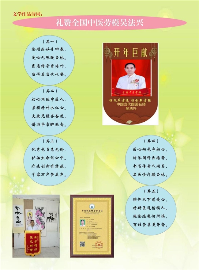 良医处世,不矜名,不记利,此其立德,此其立功也。吴法兴老师于这功在当代利在千秋的中医传承行业中,从无怨言,不追名,不逐利。凡事都致力于做到尽善尽美,医所痊愈。吴法兴老师以“大医精诚”为格言,不断精益求精,将 “传统中医文化开枝散叶满华夏”的愿景早日实现,也相信越来越多仁心博爱的年轻人和有志之士能以此为旗帜和榜样,在同一片蓝天和同一面旗帜下,传承好中国传统医术,惠万家幸福,助祖国强盛。