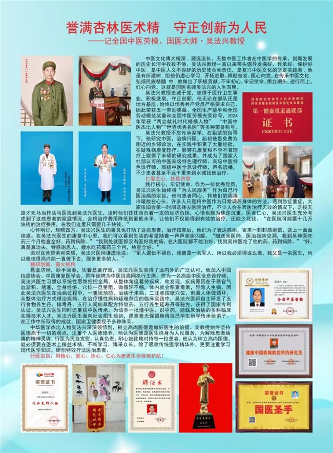 吴法兴医师是基层中医的一面旗帜,他以“精”“诚”引领自己的医学道路,执着追求,秉承“仁术慈心,修身济众”的信念守护人民健康。是基层群众的健康“守门人”,健康中国路上的筑梦者。