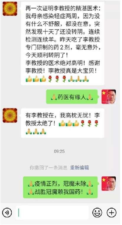 总之我服了李医师的中药,对预防和治疗新冠病毒肯定有效的,深表衷心感谢!悬壶济世!治病救人!功德无量!德艺双馨!”(闻先生Tel:13179319371)