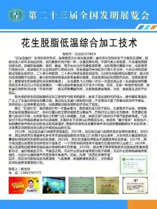 为了找到一种真正能够提升人体免疫力的蛋白质,山东省济宁市春秋植物蛋白有限公司在总经理靳光祥的带领下,开展了长期而深入的研究,创新了一种全新的蛋白质。山东省是花生大省,济宁市是花生大市,靳光祥教授具有家国情怀,抱着热爱祖国、热爱家乡的赤子之心以“花生”这种土特产品作为原料,经科学加工后,从酸性的“花生”中提取出“弱碱性复合功能活蛋白”,靳教授想走公司+农户路子,为家乡新农村建设与大健康产业作出新贡献。