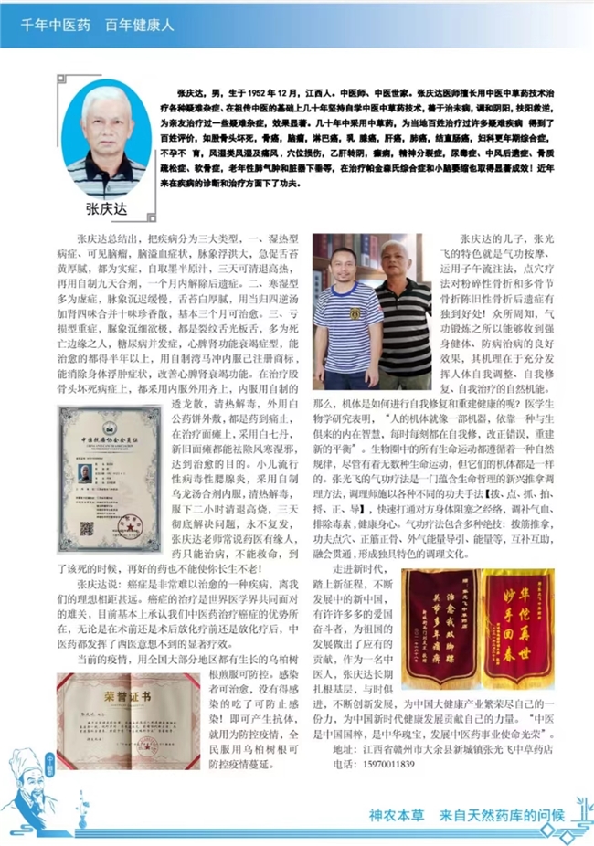 张庆达老师生于一九五二年十二月,在一九七三年七月毕业于江西省下垄矿五七高中,当年十二月下放农村接受贫下中农再教育七七年七月病退返矿,在县工商局做协议工作至七九年。八〇年元月,由下垄矿大集体招收为集体工,二〇一二年办了退休,几十年坚持自学中医中草药技术,为亲友治疗过一些疑难杂症,如骨癌,股骨头坏死,脑瘤,淋巴癌, 乳腺癌。结直肠癌,肝癌,尿毒症,肾囊肿,癫痫精神分裂症, 穴位损伤,中风后遗症及类风湿乙肝转阴等疑难杂症,效果显著,让股骨头坏死病人得到快速缓解疼痛,短期内达到治愈的目的,得到亲朋好友好评,当地百姓都说老师在新城立脚是新城人民的福份!
