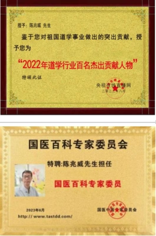 陈兆威:道号:威山道人(职业道家)籍贯江苏阜宁,1961年出生!1980年至2000年在国营企业工作。2000年至现在一直从事文化工作!现在上海世界非遗文化城,从事艺术,道学、医学等工作。