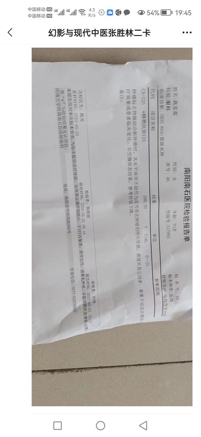 二、70岁卵巢癌腹腔转移治疗反馈