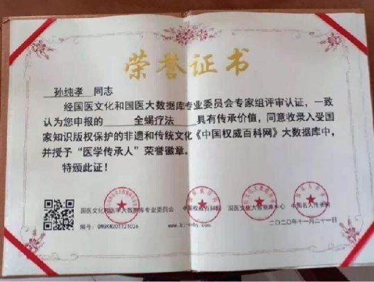 孙纯孝全蝎疗法招生培训通知:传承是中医药的生命之根,是其发展的基础和动力!孙纯孝深谙中医药学“传承”的重要性!他上守父辈德馨、下携后代传承。一份责任,一份担当,一招鲜吃遍天,要学习就跟师,学一个特色,可以养活一家人,一个特色可以救活一个店,一个特色可以造福一方百姓,一个特色能使你功成名就,让天下医友多一个健康的选择。为了让更多的人学习孙纯孝全蝎疗法创新技术,现特面向各大医院,门诊部、中医爱好者收徒传艺,期满学成者,可一生为师。