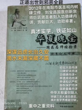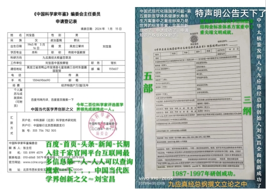 创症法候机论;创方法药机论;创针法罐机论;创经法穴机论;中医万种药之禁忌问题与解药研究临床创新进展金标准,根治心脑血管疾病中医药技术特效方法申请申报版权保护。研创中华名医太极鉴创新宗师全息特色诊疗病历书独家研创成功;刘宝昌研创人体三纲五部用药组方式加减法等数十篇创新科研新理论法则一千二百条巨著成就成功,含金量非常高。他还深入研究了《易经与本草经与内经与圣经》核对千年科学经文圣旨天机奥秘,独获全面创新成功。一直亮剑献宝。即:原始创新~易经的天地之阴阳乃包罗万象生生不息。