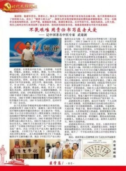 武建新,中国著名中医专家,主攻肿瘤,专治骨癌,骨髓炎、尿毒症、肝腹水、鼻癌、先天性心脏病和冠心病。武医师,家住九嶷山脉,十三岁始接受外公的医术。随外公上山采药,从采集桔梗到认识药名、药性,直至加工炮制,必须从理论到实践各个环节亲身体验,试尝百草,临床实践,亲自动手,至19岁时,正式拜师,卢永忠,卢道大,封立足、黄圣骅、黄富保、蒋金松、林成、冯义平、回龙庵孔圣法师,灵照塔早昆法师,江湖游侠矮脚虎,出道的和尚,尼姑,讨吃要饭的前辈,先后从师近百人。