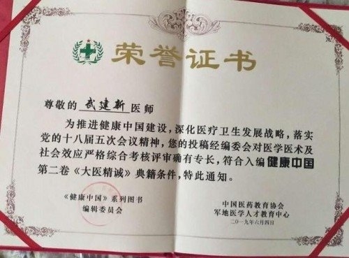 13、2007年3月22日正式编入国际医疗编委会,并在国际医疗临床协作网站中收录和表彰,中国医师网(收录为健康专家,增选武建新为中国国际专业人,才发展研究中心行业,特邀高级人才。授予全国首批优秀人才模范勋章,同年经专家委评审通过,已载入《国际医疗临床协作博览》,同时颁发《国际医学特色诊疗专家》荣誉金牌、中华医学会“中华名医”并荣获勋章。