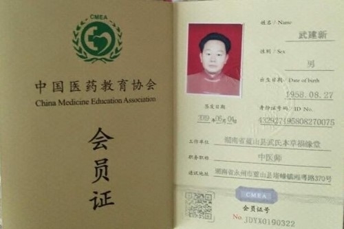 代表成就:湖南蓝山县武氏本草福缘堂创始人。