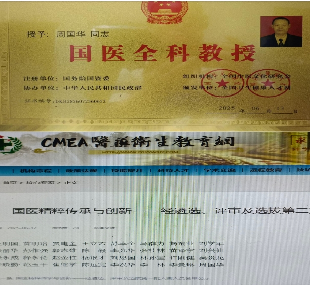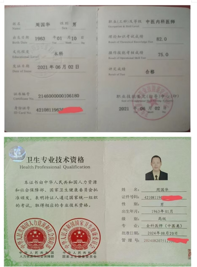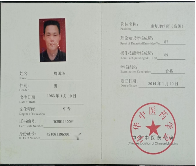 周国华医师简要: 周国华,1963年1月10日汉族,湖北省石首市人。出身于一个贫困的家庭,共青团员。(函授)本科,毕业于河北求实医科专修学院、学士学位,完成了中医学专业四年制本科(函授)学习,修完教学计划规定的全部课程!南拳枪溪功夫(一级拳师)。(中药调剂员)。((高级)中药药剂师)。(乡村医士)。((高级)康复理疗师)。(中医预防保健调理技师)。(中医内科医师),中医全科医师。(资深,中医讲师)。