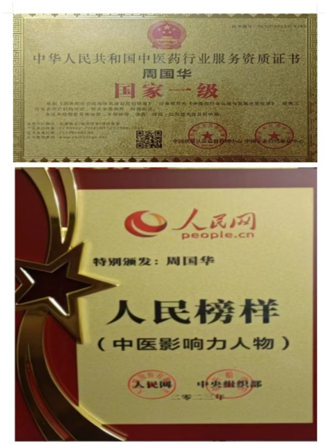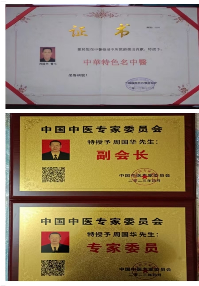 中国工程院院士。国际肿瘤委员会,中国中医专家委员会副会长。中国国际名人研究院院士。国务院国资委授予:首席国医导师国医全科教授(中华人民共和国民政部)。中国民族医药学会全科医学分会理事。中管院名誉院长,院士专家,客座教授、中医药领域科研会主席。中国医学管理研究院三部委任命(国医大师)。三部委授予:(国医大师,国宝级国医大师,国际权威肿瘤医学专家)。中国杭癌协会中医药教授(北京,湖北)。CCTV央视直播在线网,授予:(中国新时代国医大师)。CMEA中医药健康服务人才培养实施规划,《行业标准》修订工作委员会委员!全国名中医。国医名师。----周国华